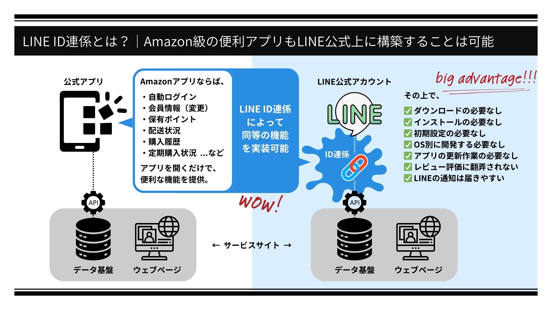 Amazonアプリは、アプリを開くだけで利用者個々にカスタマイズされたあらゆる機能が使えるようになっていて非常に便利です。このようなアプリは、常にユーザーデータと同期するように構築されていますが、実はLINE ID連係を活用すれば、LINE公式アカウント上に実装することができます。そのポイントはLINE識別子(*下記注記参照)というユーザー情報をキーとして、外部にある顧客台帳や利用者データベースと連係することが可能になるからです。
