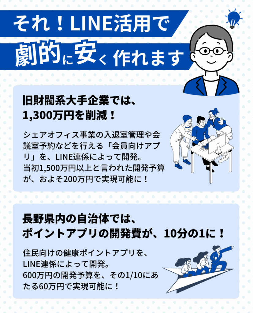 実はLINEの公式アカウントでも、Amazonや無印良品級のアプリが、かなり低コストに作れちゃうんです。当社はLINE公式を使って会員アプリや多機能アプリを開発するシステムを提供しています。